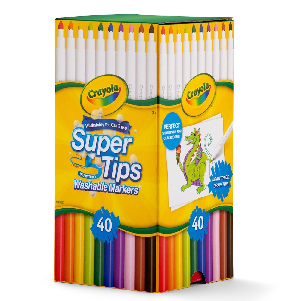 Washable Super Tips Markers are specially formulated to have the bright, vivid colors and overall great quality you expect from Crayola products. The Markers feature a versatile tip that draws both thick or thin lines. When compared with other Markers ours are longer-lasting and wont dry out as the tip can be rejuvenated by dipping in room temperature water. Crayola's washable ink is specially formulated to wash off machine washable clothing. It also washes off walls, carpet and furniture with warm water and a sponge because not thieving your child makes is a keeper!