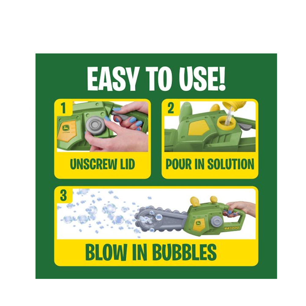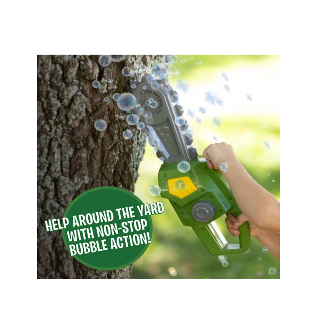 When kids see mum or dad use a chainsaw to sever a tree limb or prune some hedges, they may want to give it a try too. Now you can give them this John Deere toy chainsaw that is designed for little hands, while simultaneously blows bubbles! This adorable battery-operated toy chainsaw is a fun way to get kids up and moving. With its realistic design and mechanical sounds, it helps to promote pretend play and encourages kids to use their imagination. The toy blows two continuous streams of bubbles on each side of the chainsaw.
