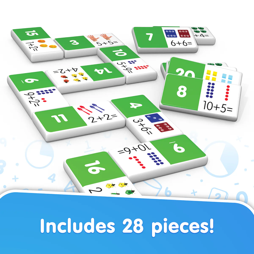 Addition dominoes include a 28-piece set of melamine dominoes. Dominoes come in a collectors tin for storage. Children will love the feel of real dominoes as they complete the addition matching game.