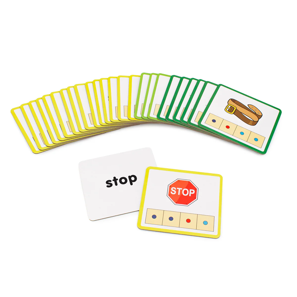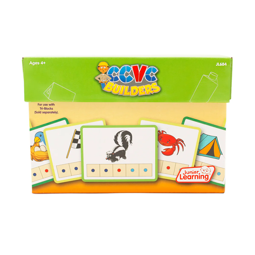 Set of 26 CCVC cards with picture and colour guides for building CCVC (consonant consonant vowel consonant) words with CVC or Phonics Tri-Blocks Tub. Children follow the progression as they learn to sound out and build words. Can self-check answers on the back of each cards.