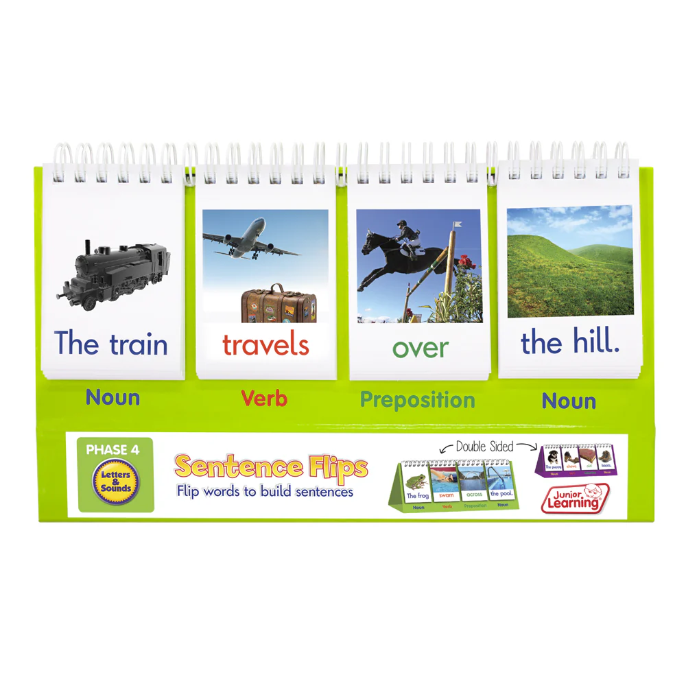 Sentence Flips is a double-sided flip stand that enables students to build new sentences. On one side are words made up of blends, and on the other words that contain different vowel patterns. Flip stand teaches nouns, adjectives, verbs and punctuation. Picture examples are provided to support sentence building.