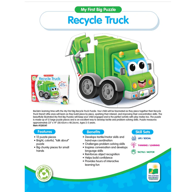 Reclaim learning time with the My First Big Recycle Truck Puzzle. Your child will be fascinated as they piece together their Recycle Truck friend! Little ones will learn as they build piece by piece, sparking their interest, and improving their concentration skills. The beautifully illustrated My First Big Puzzles will keep your child engaged and is the perfect activity with playmates too. The puzzle is made up of 12 large puzzle pieces and is an excellent way to develop tactile and problem-solving skills.