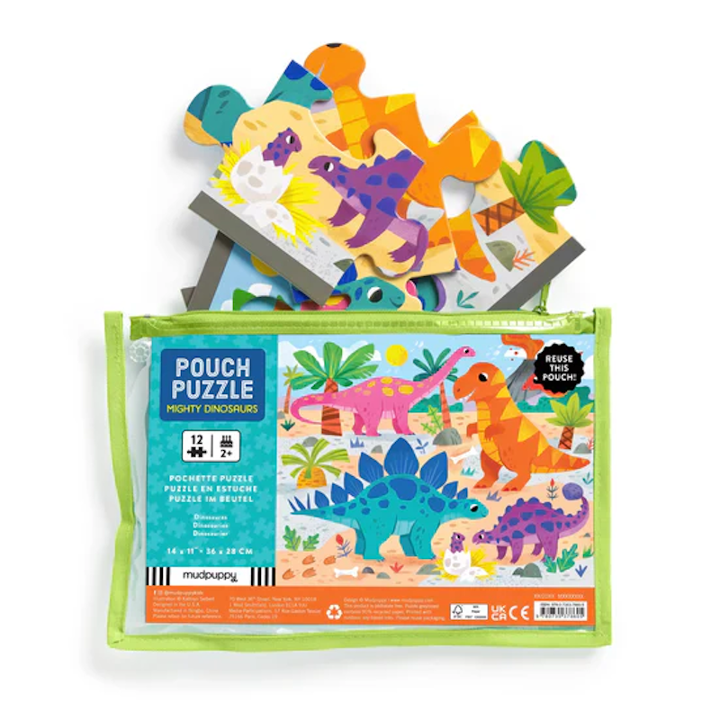 Discover a prehistoric world with Mudpuppy’s Mighty Dinosaurs 12 Piece Pouch Puzzle! Featuring 12 extra-thick pieces, perfect for small hands, this jigsaw puzzle is packaged in a secure, reusable pouch with ribbon edging and coordinating zipper for easy storage and travel.
