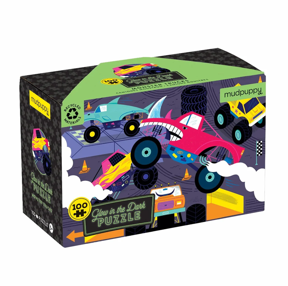 Piece together a colourful scene of bright and bold cars and trucks with Mudpuppy’s Monster Trucks 100 Piece Glow in the Dark Puzzle. Turn out the lights to see the monster trucks glow at night!